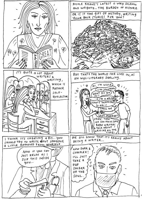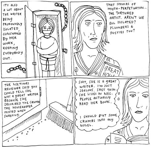 Crumbs in your novel… a speculum in your cartoon (is that the right word for it?)… wonderful! I love the pic with all the mirrors too. And I’ve always thought that writing about writers and writing is quite boring. Not visual or visceral enough.