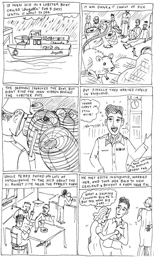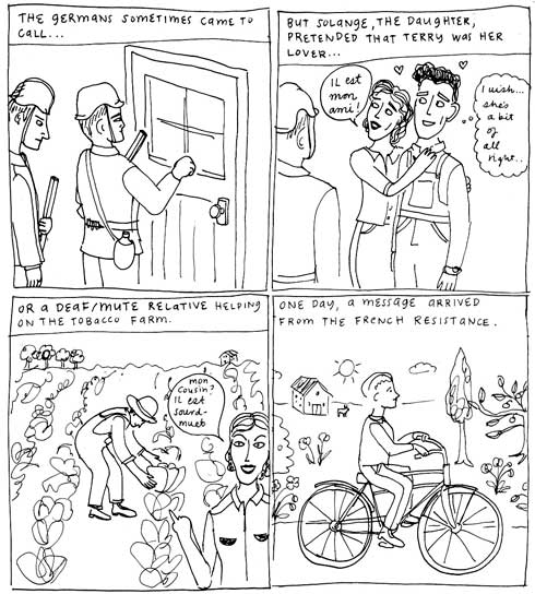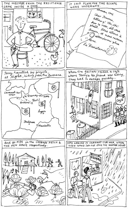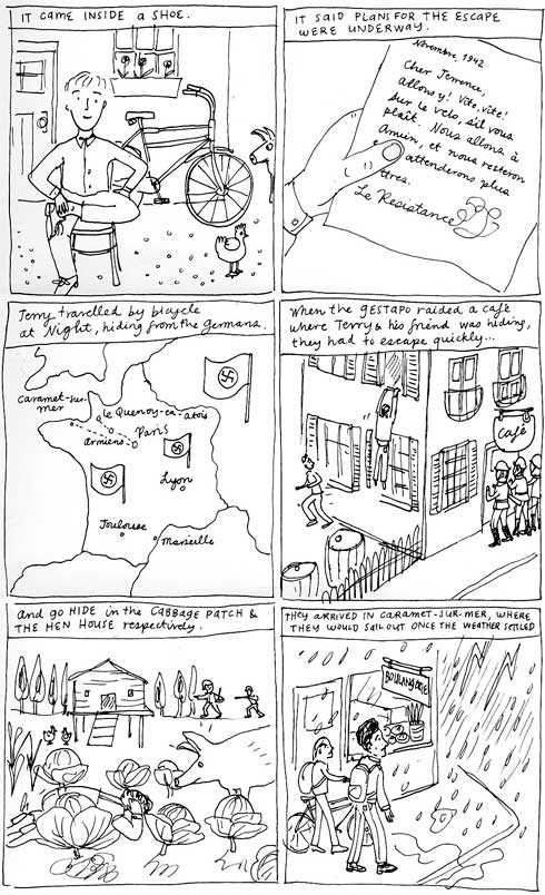 tags: bad French, bicycles, cabbages, French Resistance, great escape, lobster boats, MI9, Nazis, pigs, rats, secret messages, spies, Terry Kearins, war-time romance, WWII