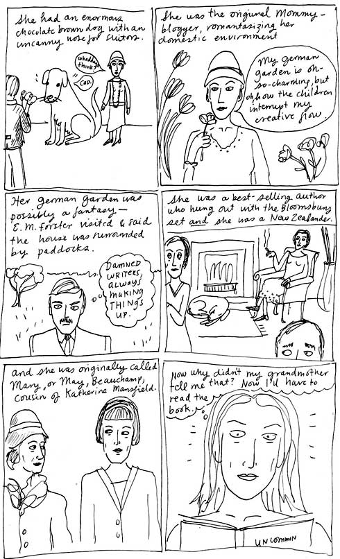 According to Wikipedia I have this completely wrong – Elizabeth von Arnim was born in Australia, and moved to England at the age of three. But that’s not the impression Katie Roiphe gave me – Roiphe said she was born in New Zealand, and her parents brought her to Europe to marry her off at the age of 23. It must be so confusing being a biographer.
