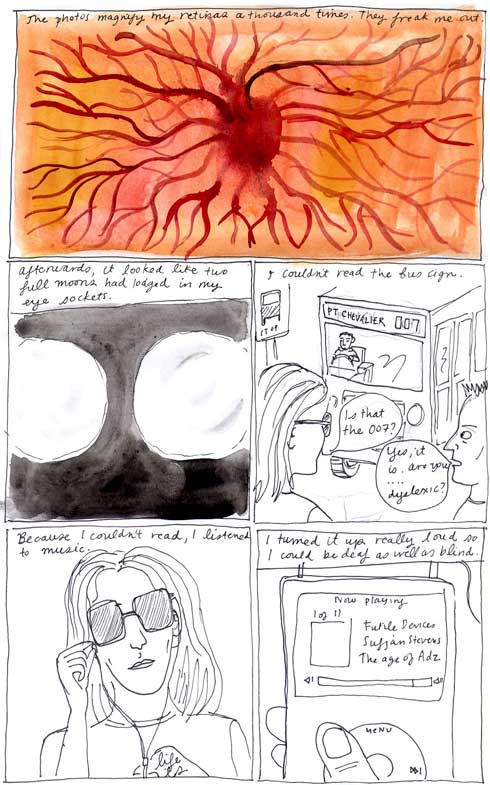 i remember this eye test. my flatmate, who’s father was a chemist, told me what they put in your eye is a cocaine derivative… the thing that people break into pharmacies for. So I had cocaine in my eye! Turned out to be just a bit of retina floating about, causing a weird cursor type effect, very common evidently. and i walk home in a blur…