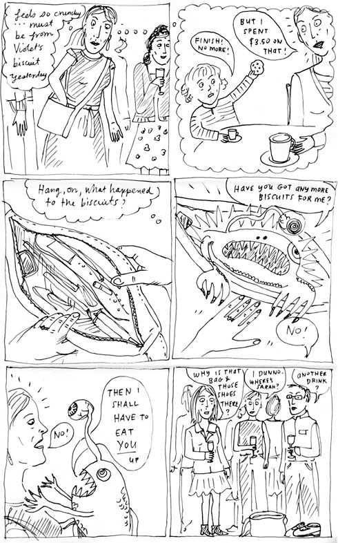 Jonathan looked at this comic and told me it was weird. ‘Weird don’t-post-it, or weird-cool?’ I said. He told me to trust my instincts. I told him my instincts weren’t trustworthy, and besides, since I was so busy with work, I didn’t have time to self-edit. I think this comic might have spawned from the book I am reading to Otto, The Key to Rondo, about a music box that sucks in two children, and possibly from the wonderful Kelly Link story I read a few years back, The Faery Handbag.