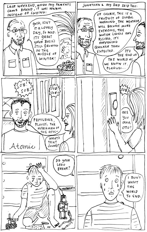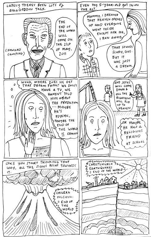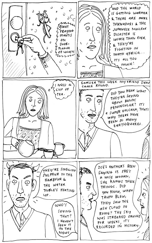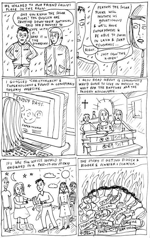 In a moment of beautiful synchronicity, just as I finished this cartoon, the phone rang. There was an automated message: ‘Are volcanoes, earthquakes, floods and other disasters making you nervous? Now more than ever, you need insurance.’ Another sentence added to that scary story.