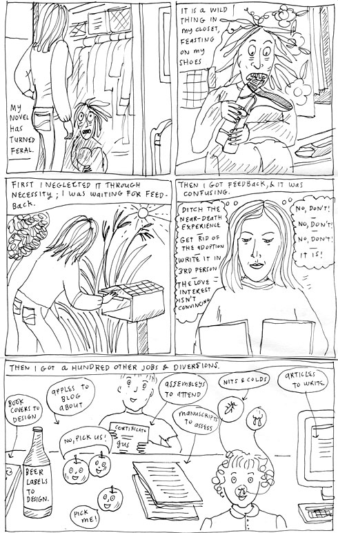 I was handed an article once in a writing class. I can’t remember which class, or who the article was by. It described one’s writing as something liable to go wild if neglected for even a day. I think the author’s writing was personified as a child, but mine is a dreadlocked man, a cousin of the Novel Beast. This metaphor made me think a little of Emma Donoghue’s Room, which was excellent and rather disturbing, but not nearly as harrowing as I thought it might be. I really liked the way Donoghue imagined what it would be like for the boy once he came out of the room – how the light would be too bright, how his brain wouldn’t be wired to gauge distances. How strange he would be in the context of the world. But anyway, enough procrastinating. I must reread my manuscript and figure out what to do with it!!