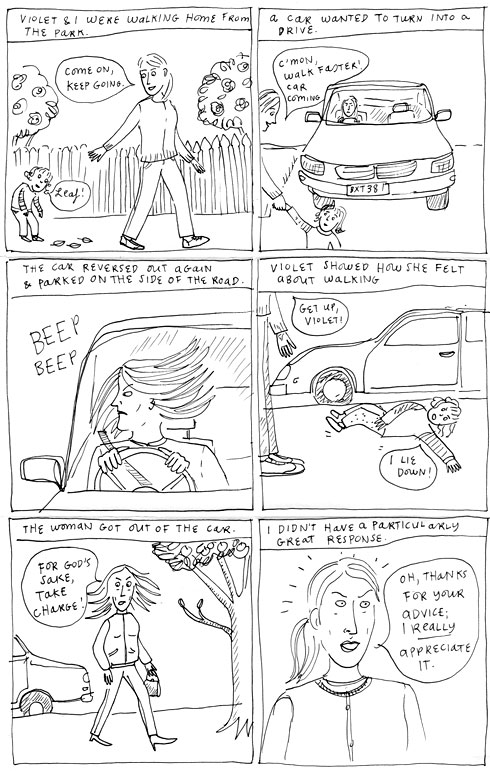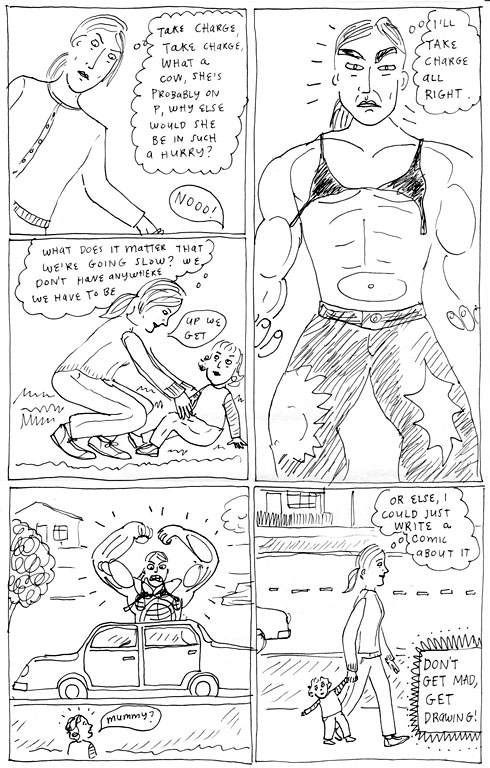 Oh wow, what a super-helpful woman, I mean total cow. Well done for being restrained in your response! I get a lot of crap from people when we are out because Magnus looks ‘normal’ then does erratic things – so people think he is naughty and I am a shit mother. For a while he had a thing about slapping his hands onto big bottoms – he just liked the way it sounded, I think – you can imagine how that went down in public….I never tell people about him though, because I believe that people should learn to be more tolerant and patient around kids generally. (Sorry, raving now….you touched a nerve.) Great comic, as always. xxxx H