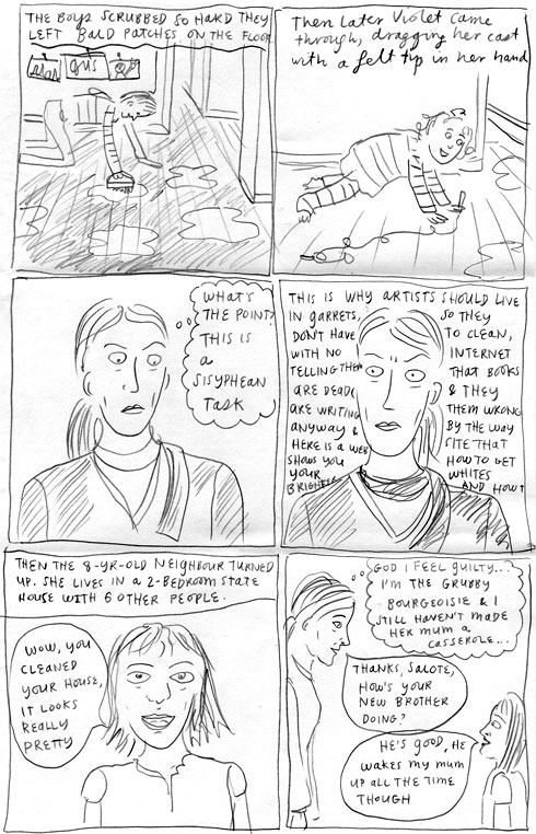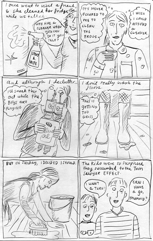 Thanks, everyone, nice to know that I won’t be publicly flayed for having a grimy house! And I will try not to apologise to Gus’s playdate’s mother this afternoon when she comes over. After all, we are being child-centered and artistic!