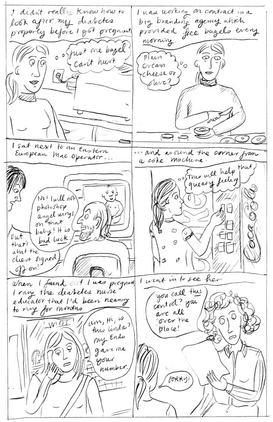 I agree with everyone else that this is an interesting storyline. The end of part one where the last panel says the only thing you let yourself buy before the birth of your first baby was one stretch and grow suit was so poignant. That fear of not knowing whether your baby will survive must be the case for all mothers (and fathers), but that fear must be exacerbated by having something like diabetes. I don’t think this work is just interesting to mothers (even if 18 year old boys in scriptwriting classes might indicate otherwise!). Your blog reflects the challenges of modern womanhood where ‘Girls Can Do Anything’ has morphed into ‘Why Am I Not Capable of Doing Everything Perfectly and in a Timely Fashion While Looking Hot?’. I know I suffer from this and find great solace in your work and I’m not a mother and have no intention of becoming one…….I’ll put the pom poms down now. Thanks!