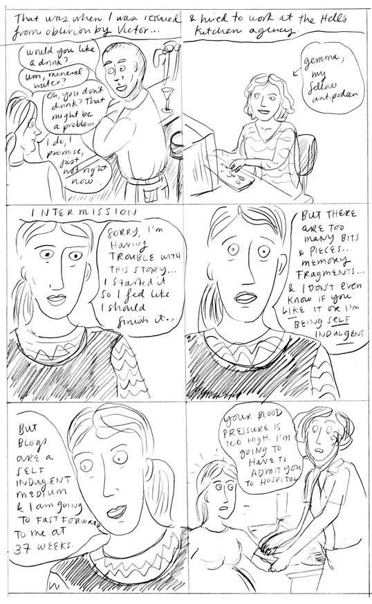 This story has got out of control and I’m going to have to write a part 4 to finish it! So what do you think? Is it just boring when I write these mini-memoirs? Perhaps my motherhood-implosion or writing-angst posts strike more of a cord? Of course I am drawing these comics because I feel like it, and it’s nice when other people enjoy them. But since this is a blog, I get more of an idea about whether my writing strikes a cord by the number of comments and visits. When you publish a novel it is an entirely different experience – you have no idea what your audience likes until they have finished the whole book.