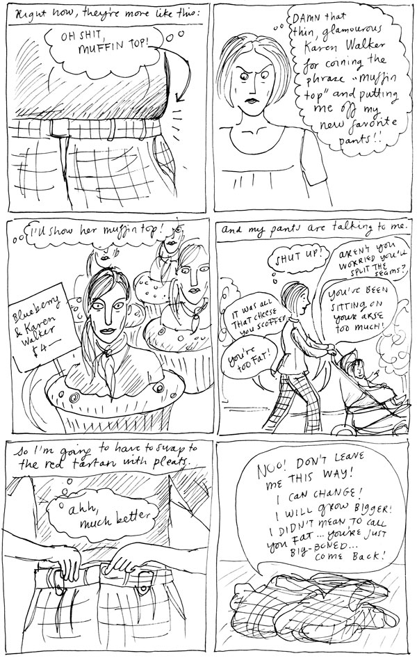 Karen Walker Blueberry (Burberry?) muffins: that’s made my Friday. I’m a size 28 according to the Good As Gold salesboy. Believed him, and now the pressure’s on to (non)sustain current spareness. It’s an ongoing fashion conspiracy.