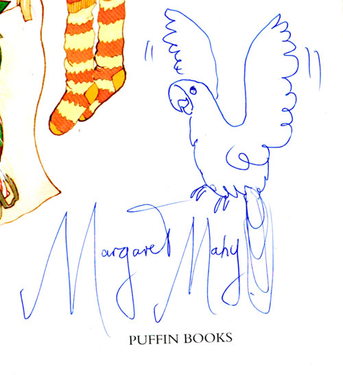 Margaret Mahy, one of my favourite authors as a child, and now as a parent reading to my children, died on Monday. I plan on doing a proper tribute here, but in the mean time you can read my piece in the Listener, amongst some other wonderful tributes. This is her signature from our beloved copy of ‘The man whose mother was a pirate’. She’s a good drawer. Maybe she could have been a cartoonist too.