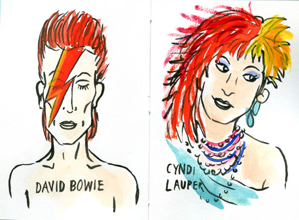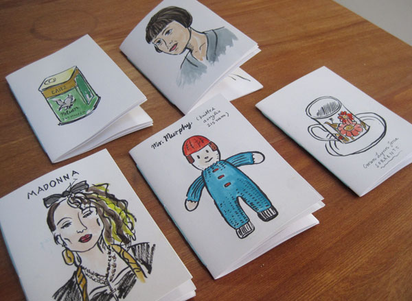 Over this weekend, I’ve been making some books. Each book is 12 pages long and bound with embroidery thread. I had a few rules for myself: I would ink each picture without penciling first, and they had to be groups of things. Eighties pop icons, toys made for my children, significant women, my tea cup collection, and cans in my cupboard. I’m going to be selling these books for $15 each at the Zine Fest this Thursday night at St Kevin’s Arcade on K Road, Auckland.