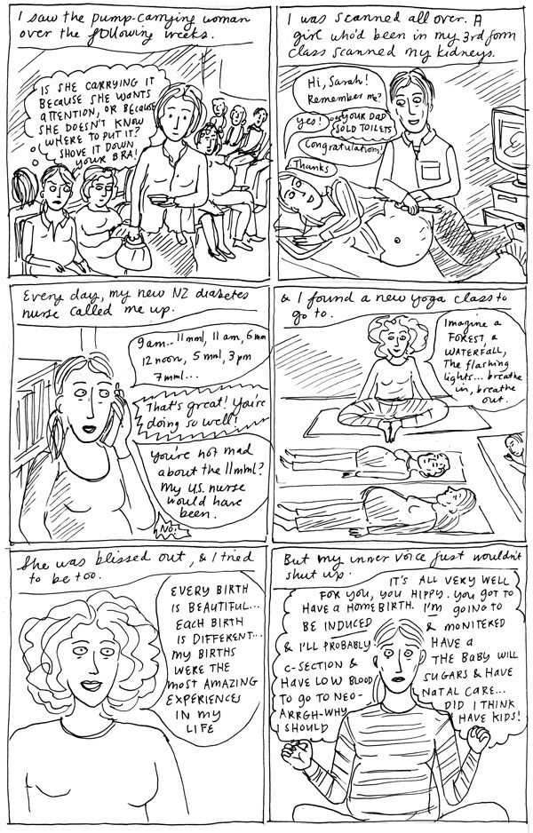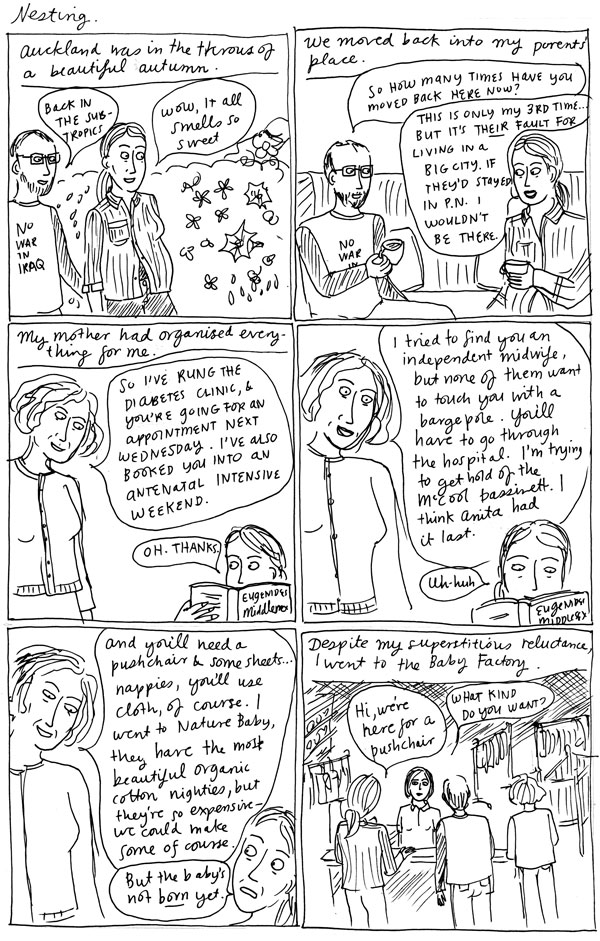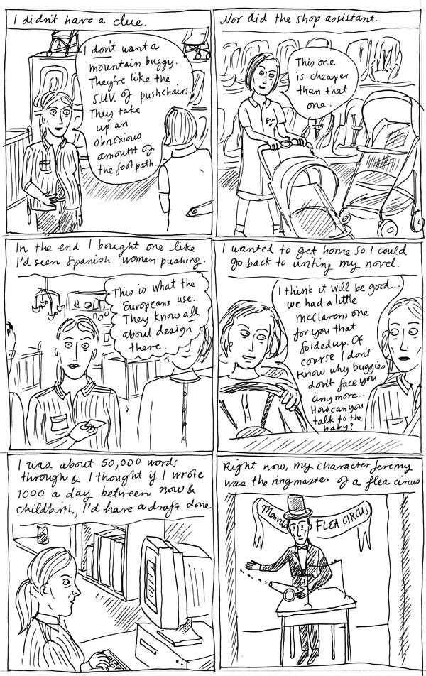 Sorry about the radio silence in my blog. I’ve been busy lately, drawing dancing people for my friend Ange, writing essays, revising my novel, looking for agents (I will have to do a comic about that one!) and doing my latest comic for Metro. I’m getting nearer to the end of this serial – next episode will be the beginning of the birth experience. I do think I have lots of things I could explore further in this, and I might revisit it and do a second draft. Anyway, thank you for being so patient!