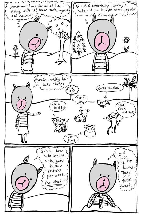 for what it’s worth, i love your comics and i prefer the people to the cute animals. it may not be the road to riches, but you never know… also thanks to your blog i got to read Hidden and find out about other great writers and artists as well. So, thanks!