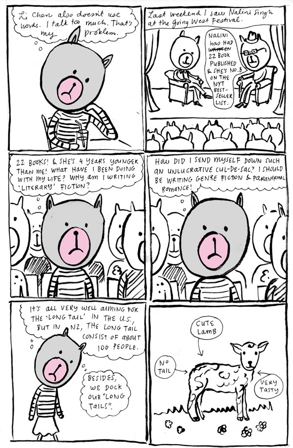 since friending you on FB I have read all of your comics (including the archives) and I think they are great. And I know at least 3 friends that would also enjoy them so I will pass your blogsite to them. I wouldn’t have even known about your blog if I hadn’t got in touch with you about that other matter. So how do people hear about Li Chen? Is it just word of mouth? Because word of mouth isn’t working for me given that we have mutual friends and I have read of book of yours… hmmmm.