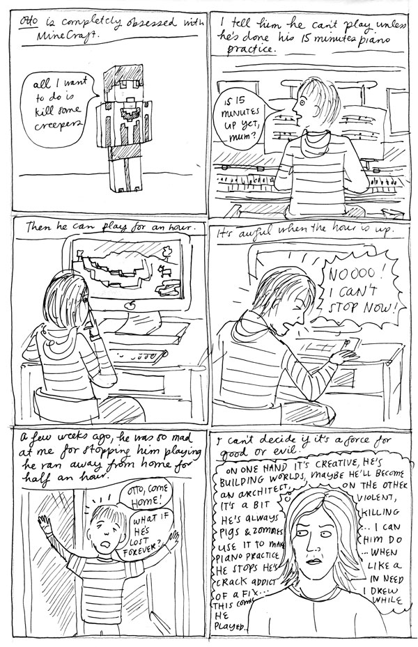 It’s the school holidays now, and the kids are at home with me, which doesn’t leave me much time to draw comics. But I have been pecking away at this one, one panel at a time, and now I present you with a snapshot of what my kids are in to right now.