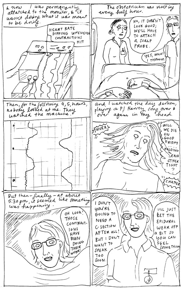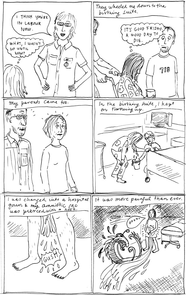 I am conscious that there may be medical people out there reading this and I probably have stuff wrong. It was 9 years ago, and this is what I remember. There was a lot of detail that I had to leave out to tell the story in comic form, and probably some detail that I should have left out. I’m not sure if I’m going to continue this story on my blog, or whether I might put it aside for a while to revise and expand. I still haven’t told you what happened with my novel manuscript. If you’re desperate to find out what happens next in the birthing suite, the first story in my anthology, ‘Coming Up Roses’, is pretty autobiographical. It looks like you can buy it on Amazon too.