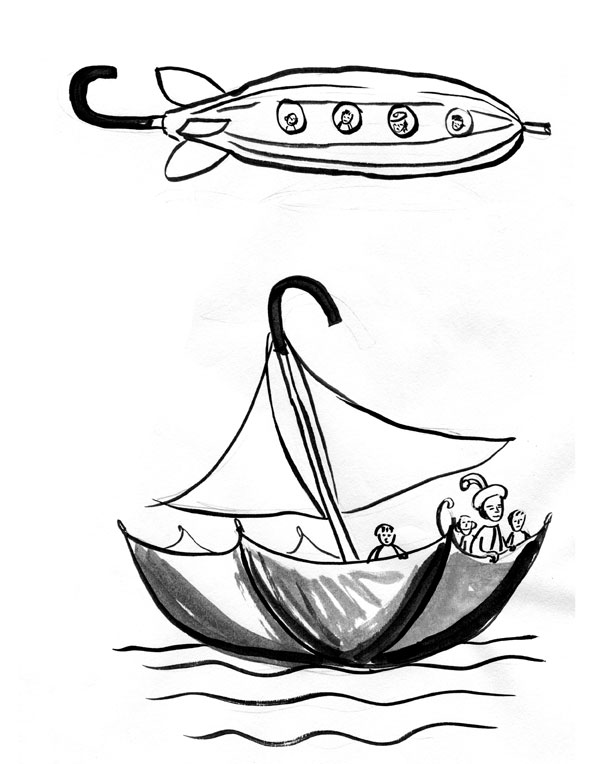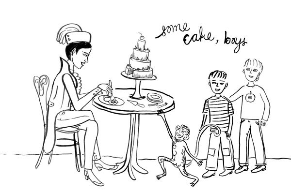 Matilda took the boys lots of places in her magic umbrella – they went to Cairo and to Rome. Chuckles was a little kleptomaniac with a penchant for purple, so he was always getting them into trouble, whipping off with the Pope’s ring and sacred cats in Egyptian temples. The story would always involve some kind of feast because somebody once told me that food was an essential ingredient in children’s stories, kind of like sex was in adult novels.