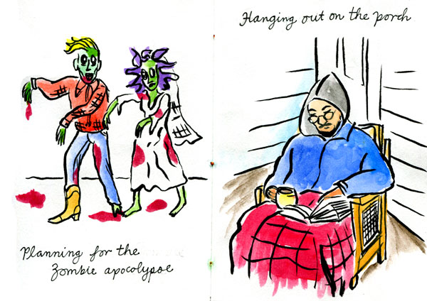 A few months ago, Emma asked me to make a book for her husband Tom for his birthday present. I’ve never met Tom, but Emma sneakily quizzed him about his favourite things and then sent me some links to her flickr photo stream. I approve Tom’s favourite things. I like doing a lot of that stuff myself, even though I’ve never given much thought to the zombie apocalypse.