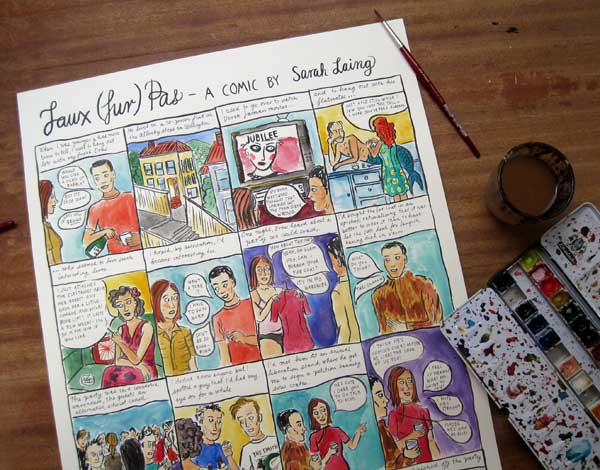 It’s a little story about how I used to get up to mischief with my friend Drew in Wellington. I coloured it with watercolour. The exhibition should be exciting – there are lots of great NZ cartoonists included, as well as a room full of German comics. I think there will even be a NZCC stand selling comics. I’ll try and get some of mine printed off to sell too. If you live in Auckland you should come along to the opening on the 28th of February – there will be wine and snacks.