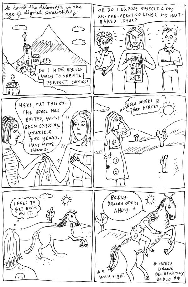 I’m conscious of the fact that I haven’t been posting many comics here lately. I’ve just been posting news, which can get kind of boring, I know. Sorry. Here is a hastily-drawn comic – a kind of rally cry to myself, to remind myself that I need to draw more and not worry about them so much. Really I should have finished a few of my thoughts. But had I done that it would have taken me too long and I would have got myself tied up in knots.