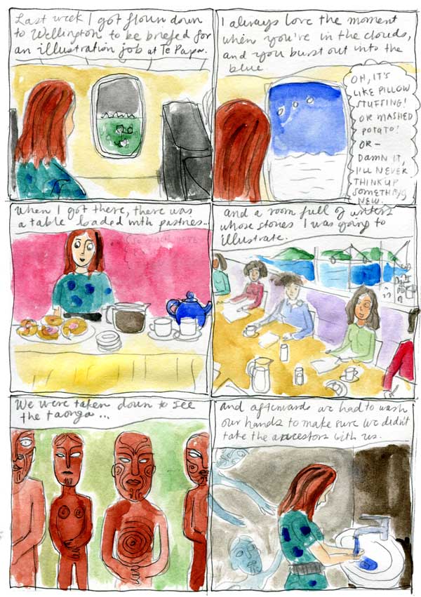 Something exciting happened last week – I got ‘freshly pressed’ by WordPress  – my ‘Night Walking’ comic was selected as a featured post on the WordPress home page. Which means I got a whole pile of international visitors – welcome!! So I probably need to explain what Te Papa is (New Zealand’s National museum) and what the word ‘taonga’ means (treasures).