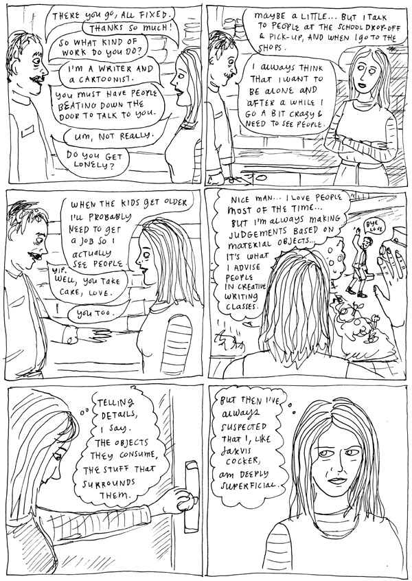 Oh, and here’s that Jarvis Cocker song I was talking about. He doesn’t say ‘deeply superficial’ – instead he says ‘I am profoundly shallow.’ I can’t remember song lyrics for the life of me. All my lyric remembering was used up in my youthful Smiths devotion. In another song on the same album he says ‘don’t write a novel, a shopping list is better.’ I wonder if his advice should be taken.