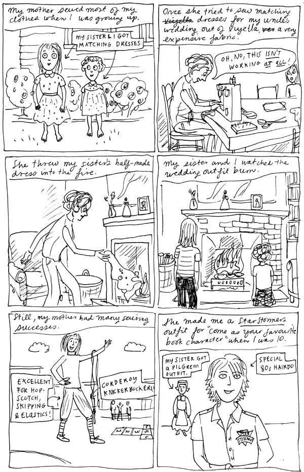 Last week a journalist came round to interview me about my forthcoming novel and he was very relieved to hear that I wasn’t sewing anymore. He seemed to think, based on my old neglected Poppyshock blog, that I was sickeningly productive. I tried to explain that it was all smoke and mirrors, and that I didn’t do very much, but what I did do I photographed in its best light. I also tried to explain how, when I had small children, I had to make things because I couldn’t stand for days to slip past with nothing to show for themselves apart from a few new stains on my once-fancy clothes. I told him about my mother, who is always making things and improving things. I told him that now I don’t do anything apart from write and draw comics. I don’t really miss the making of things – maybe I will, when I get more time. Maybe I’ll even take up sewing again, once I get that room of my own.