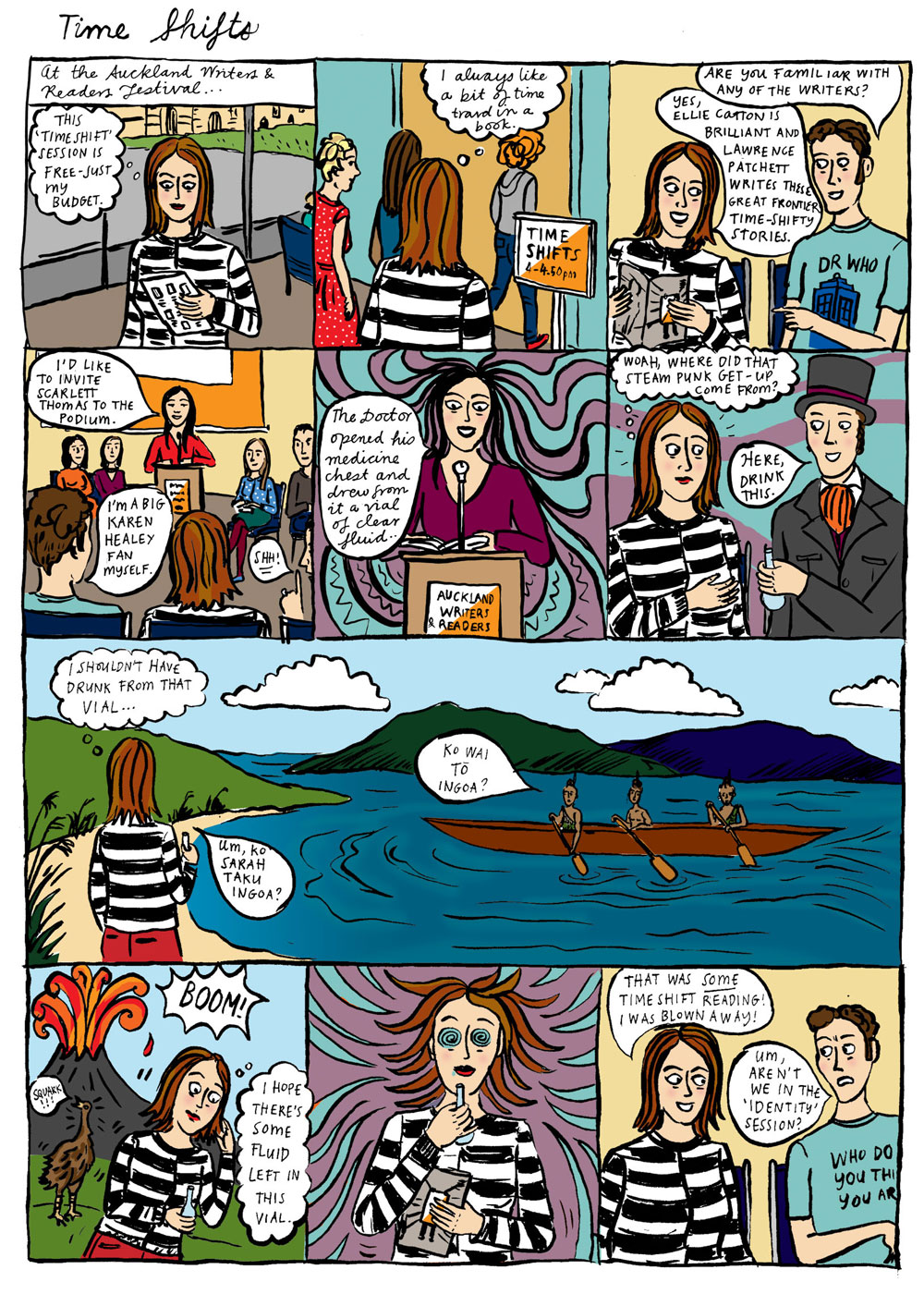 This is my comic from May’s Metro magazine. It was about the Writers’ Festival – my brief is to be quite current about local events. I wrote it just before I read Scarlett Thomas’s book ‘The End of Mr Y’, which was quite intoxicating and brainy, full of quantum physics and travel into weird realms. I am always impressed by people who can write fantastical fiction. I usually find myself writing in a realist vein (although there were a few magi-realist stories slipped into my first collection.) I can draw surreal, fantastical stuff – my hand slips out of reality more easily than the language part of my brain does.