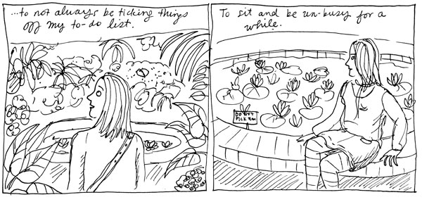 The trouble with the internet is that it makes me feel I should be doing more – always…so I turn it off and disappear for while. Unbusy is the new busy. There’s a lovely rueful feel to this comic, Sarah. I hope you find some unbusy time soon.