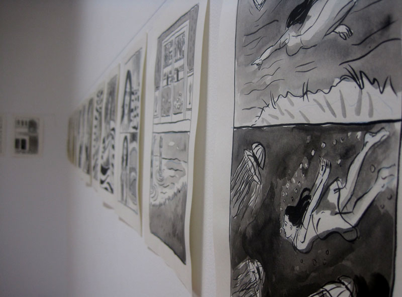 Here is some of the work hanging. I hung about 60 pieces and then realised that I had positioned them too far apart, so I had to re-position them. The entire illustrative part of the book fit in the gallery, as if I’d designed it with Snowwhite in mind.