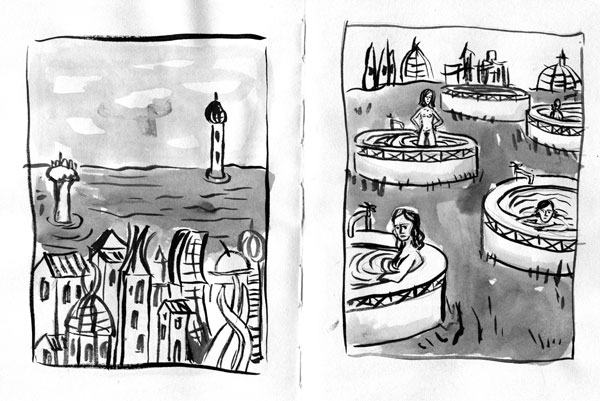 When I was creating the images for The Fall of Light, I had a sketch book. It was small, stitched, with a Kraft paper cover and creamy pages. It wasn’t expensive – it cost $6 at the local dollar shop. I drew lots of cityscapes in preparation for my real images – I wanted to understand how they worked. I only ever took life drawing classes so perspective was not my strong point. I drew with brush and ink, directly on the paper, trying to get the jist of things, to find the vanishing points.