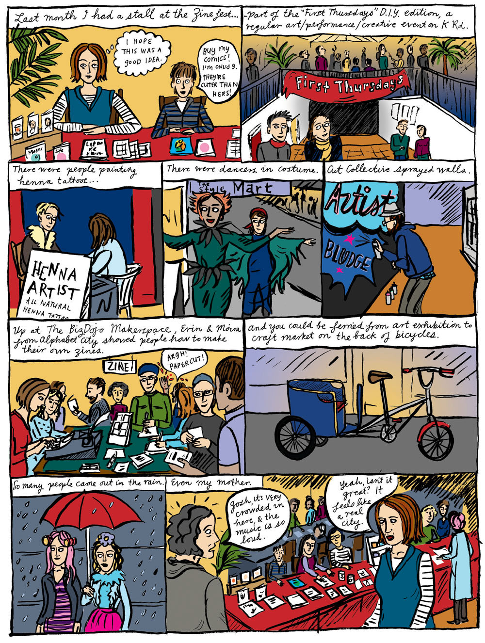 This is a comic I did for Metro last year about the zine fest, which was part of the First Thursdays event on K Road. The zine fest is running again this year, this time on Saturday 27 July at St Kevin’s Arcade, K Road, between 12 and 5. I’m sharing a table with my sister, who is selling her art book ‘Commonly Occurring‘. I was meant to also be sharing it with my son Otto but he hasn’t made any zines lately and I don’t want to push it for fear of becoming Mommy Dearest. Anyway, I don’t want him to steal my thunder – I’m going to be selling issues #1-#4 of ‘Let Me Be Frank’, with a few copies of my novel under the table as they don’t strictly qualify as zines. Just ask – it’ll be all subterfuge-y and black market-ish. I’ll even sign them.