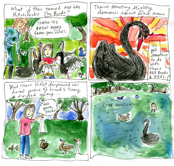 Glad you fished this comic out of your journal. I like it. We used to keep geese instead of guard dogs where I grew up, which worked fine until someone stole them and plucked them (presumably, from the feather trail they left) en route to where their van was parked. I always remember being warned that a geese and swans can break your leg with the force of their wings.