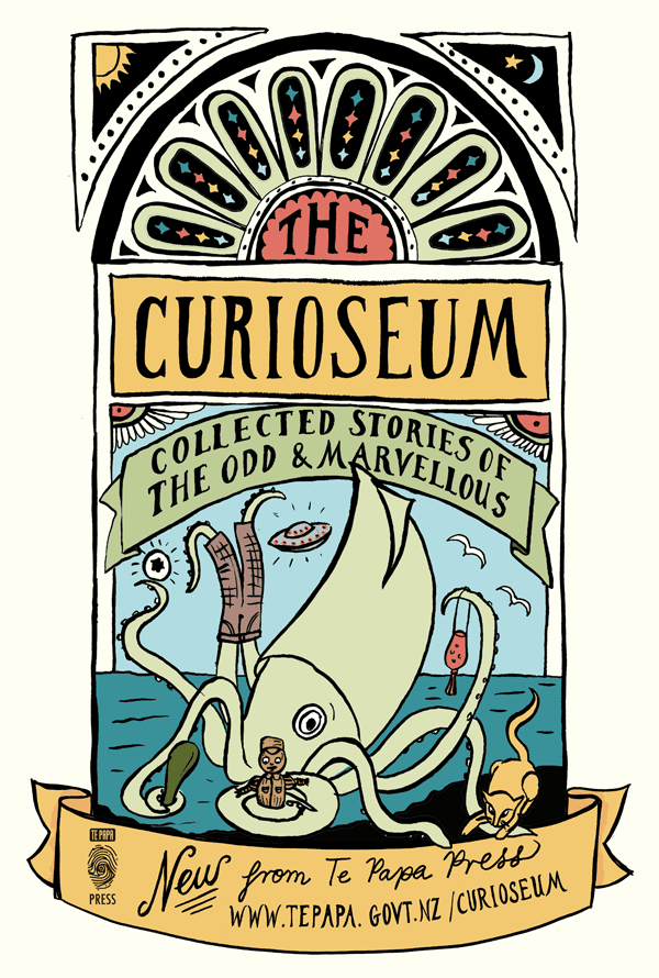 To tell you a bit more about The Curioseum – it’s a book designed for 8-12 year olds, and some of New Zealand’s best children’s authors have written stories inspired by objects at Te Papa. I got to riff off writing by legends like Joy Cowley, Margaret Mahy, Bill Manhire and Elizabeth Knox to name a few. I’m going to be running an illustration workshop for kids at 11am on Sunday 9 March, which is free.