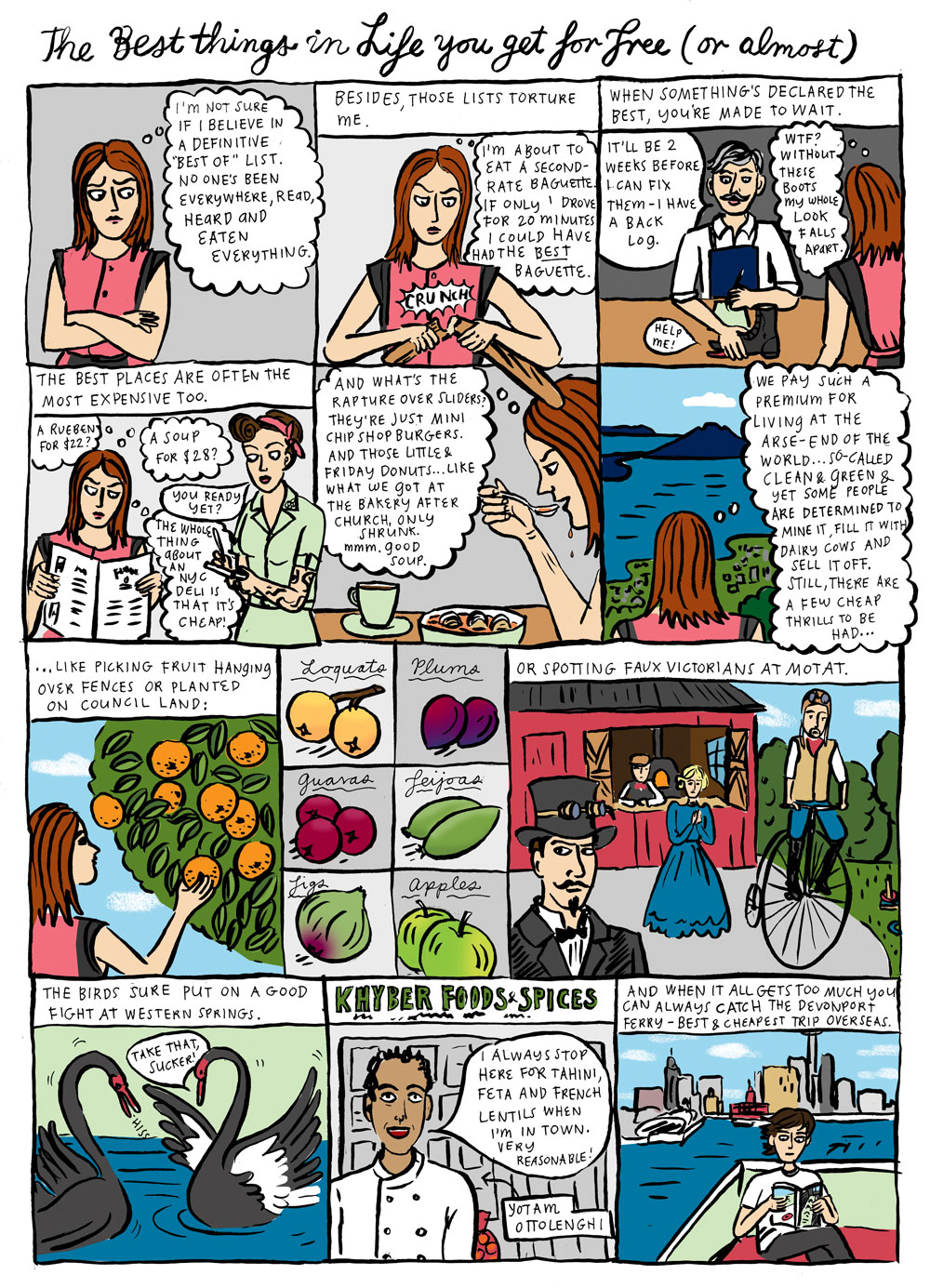 I made this comic last year for the Metro Best of Auckland issue. I approached this task with some ambivalence – my novel was up for the best-of lists and I was already bracing myself for the scores of omissions. And no, it didn’t make it onto the Metro best books list. But I set about collating my favourite things about Auckland all the same – scrumping free fruit, seeing the steam punks at MOTAT, watching the black swans fight and sing like oboes. And – of course – taking the ferry to Devonport, which always makes me feel like I’m off to Melbourne.