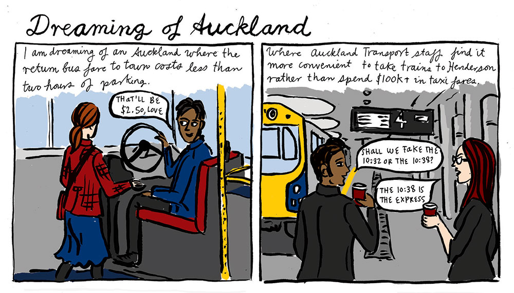 And here is a sneak preview of the comic I’ve got running in the next issue – it’s my public transport fantasia, where Auckland trains are reliable, you can hook bikes on the front of buses, and pedestrians get to share inner city spaces with trams.
