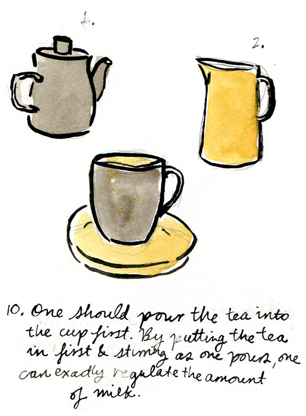 I was first shown this essay when I was in high school, soon after I’d read 1984. I was impressed at how exacting Orwell was about tea-making, how much attention he paid to each step. Also – six spoons of loose-leaf tea – obviously the man hadn’t discovered coffee.
