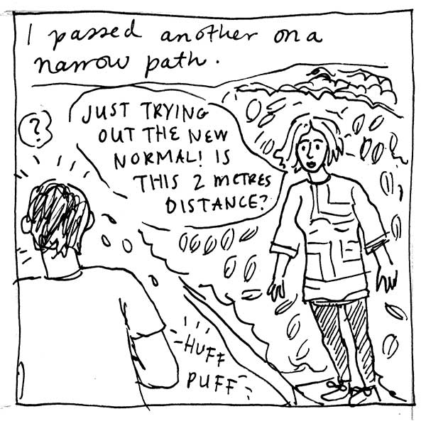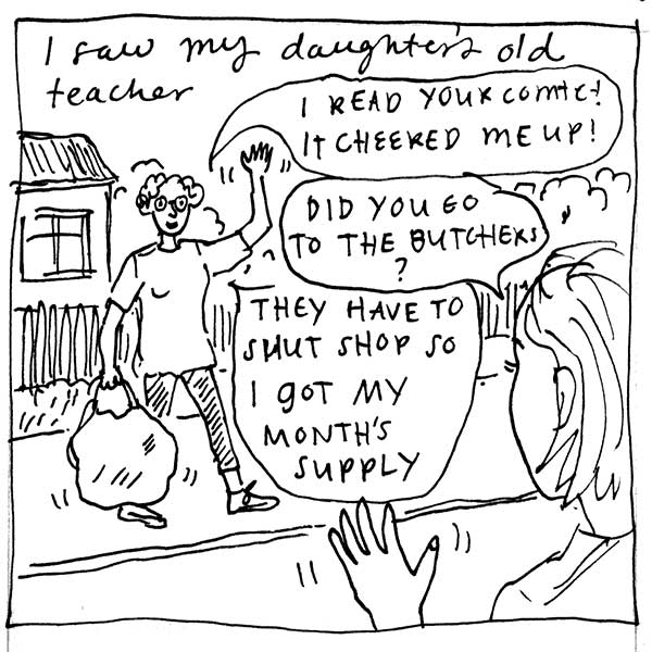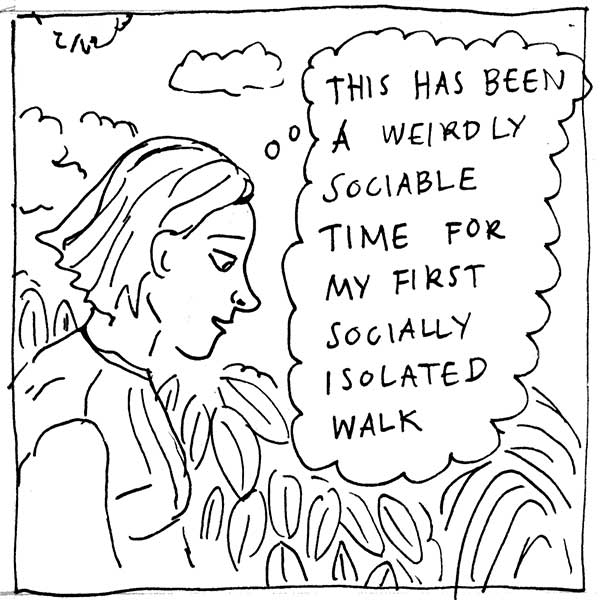 I went for 2 walks (one with the kids & one without) and had a quick chat to my neighbour from well over 2 metres away. Trying very hard just to think in the present, I’ll go cuckoo if I start thinking ahead. Thank you for your comic it is very comforting