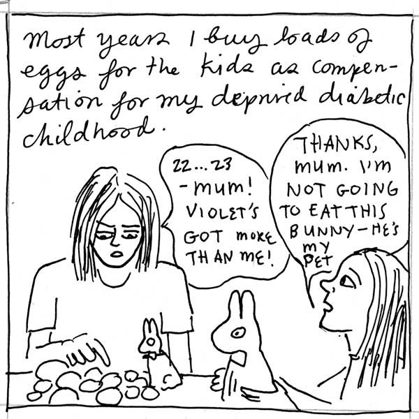 Funnily enough now when I go to our lovely Wholegrain Organics shop they sell these delightful carob coconut treats. They now taste completely normal to me. I think when Calico Pie sold them they hadn’t quite worked out how to treat carob. Still tell Violet I will need to have on my tombstone, Carob Easter egg giver! But you becoming diabetic corresponded to a time when I was learning about healthy diet. Easter Bunny was doomed. Sorry