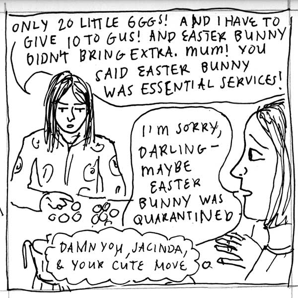 For those of you not in NZ (hi! Thanks for reading!), last week Jacinda Ardern declared Easter Bunny and the Tooth Fairy essential services. Which was cute, but I was hoping for a pass this Easter. I’m a little bit bah humbug about Easter – I no longer spend the weekend going to the Catholic church with my mother, and I was never really allowed to indulge in the treats and had to watch my brother and sister scoff chocolate while I choked down the carob egg, which was always a little earthy and chalky and never convincing. I did make some buns, though! They were quite nice, but they did their inevitable trick of making my blood sugar levels high and then horribly low when I tried to correct them with insulin and a walk. To add to the cognitive dissonance, now that many of us have abandoned religion, we are approximating a European spring celebration in the middle of Autumn. All of the colourful egg pictures Violet and I taped to the garage (thanks, Jacinda for the templates!) blew off in wet squall.