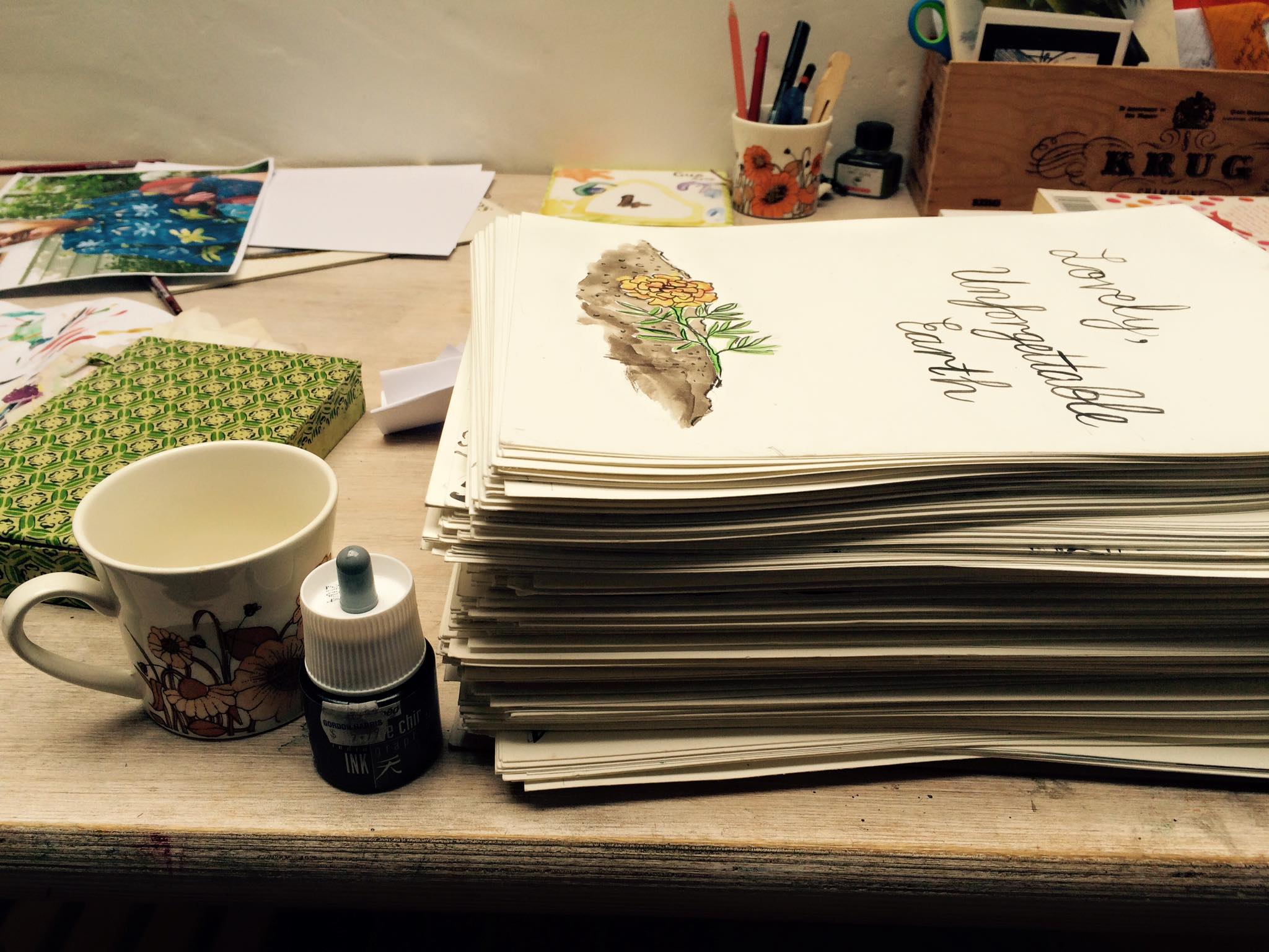 Oh, and look, here is my manuscript! It’s over 300 pages but looks really huge because I hand painted it all on heavy paper. I still have to go back and revise stuff, and now Gerri Kimber’s found some poems from Katherine Mansfield’s lost years, so maybe I can bring some of that to the manuscript. But still, I feel a sense of achievement having got this far.