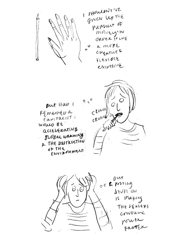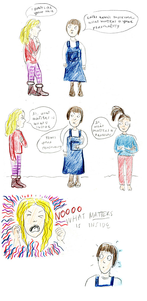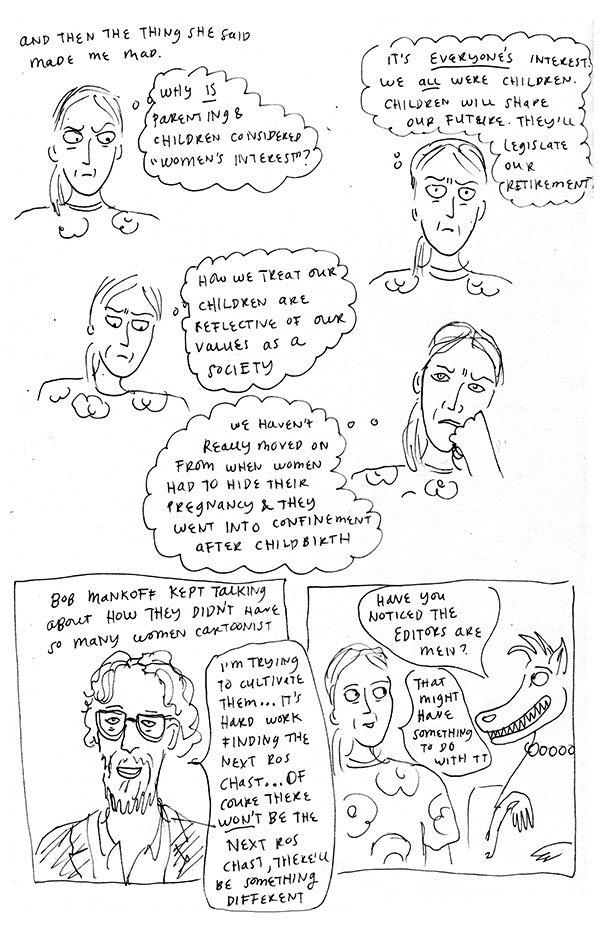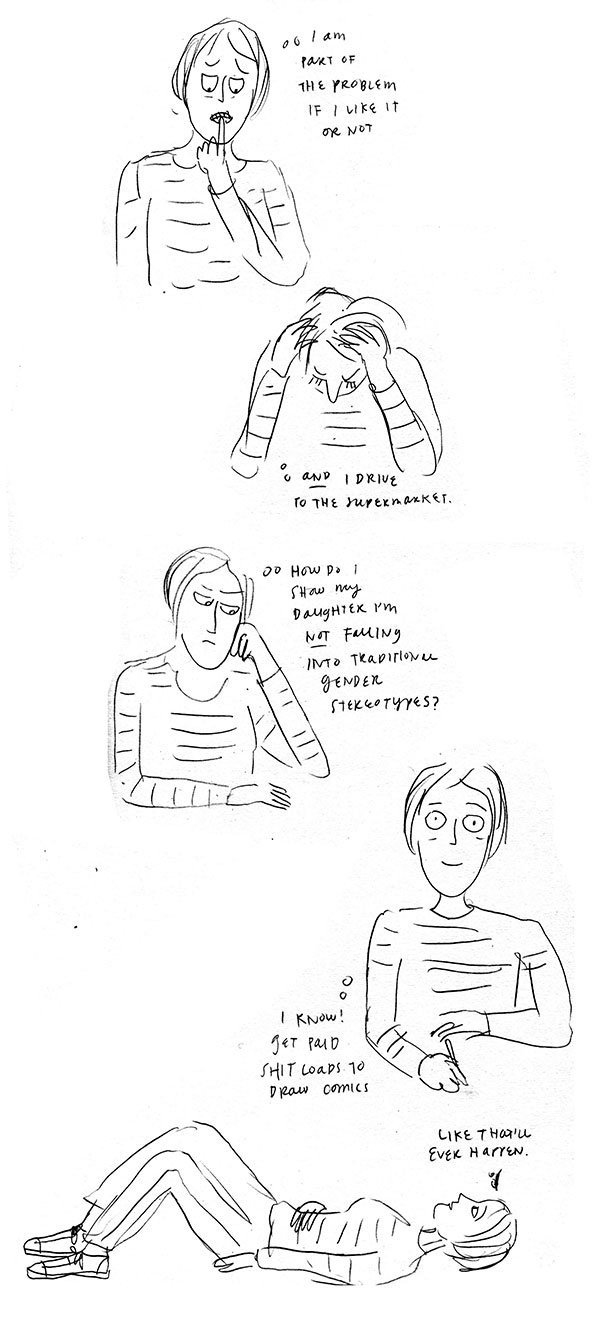 I gave my character different hair in this comic – I am experimenting with a persona, as I do potentially have a new job drawing comics (alas not being paid squidillions for it) and I am exploring what I might do – observational stuff, like I post on this blog, or perhaps some kind of fictional drama, like what Posey Simmonds did for the Guardian. Of course she wrote this when print still reigned supreme and people didn’t read everything on their tiny phone screens.