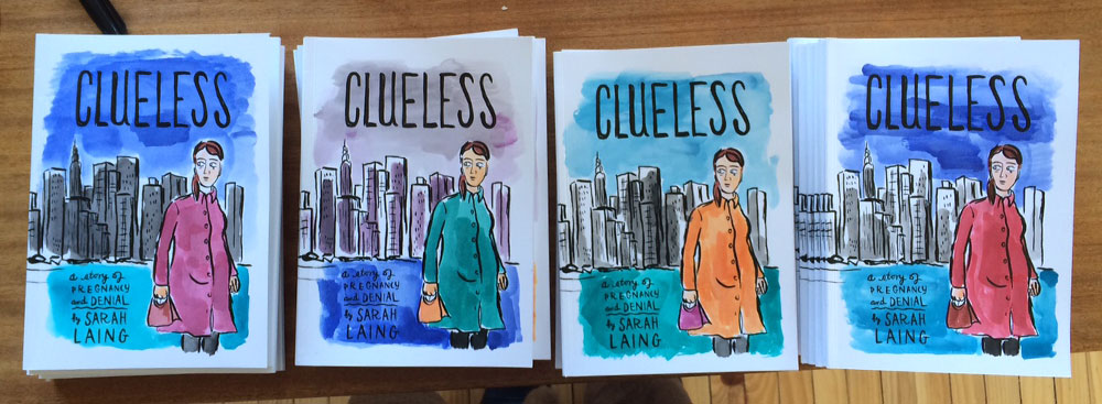 This weekend, I am going up to Auckland Zinefest. I have got a comic to sell – the print version of my ‘Clueless‘ comic, about being pregnant in New York City – which I first published here. I have fixed a few spelling mistakes, redrawn the shabbiest of the pictures and am hand-painting the covers of 50 copies. It’s a whopping 56 pages long. If you come to Zinefest (this year it’s at the Pitt Street Methodist Church, Saturday 29th August, 12-5pm) you can buy a copy for $10. I will be selling the remaining copies on Felt for $12+postage. Message me if you want me to save you a copy!