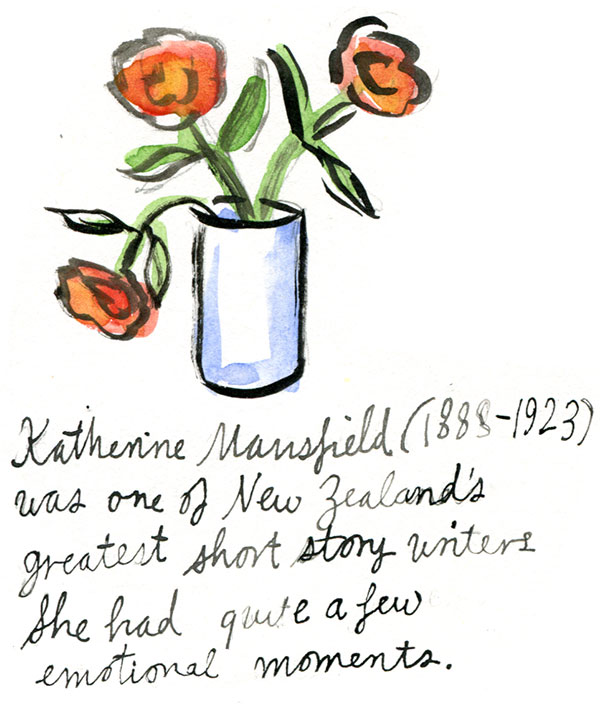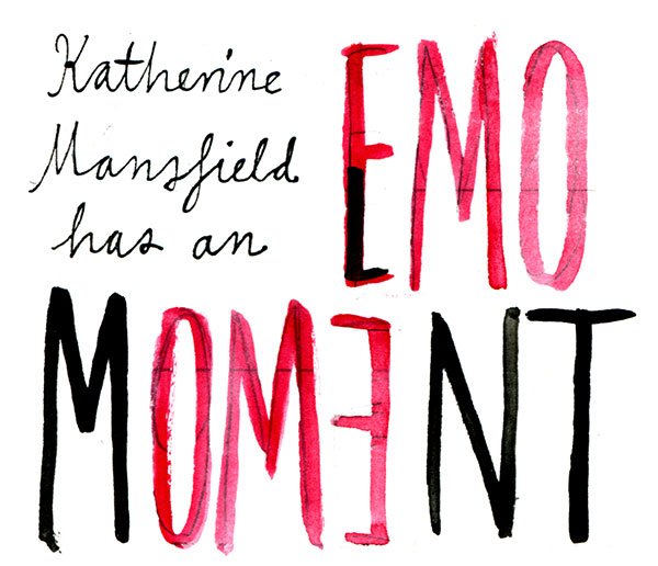 Here is another little zine I’ve made for the day: Katherine Mansfield has an emo moment. I kept on messing it up, blobbing black ink in all the wrong places, and I had visions of doing a whole series of these but it’s Wednesday already and I haven’t started.
