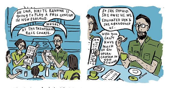 This is my comic for the last issue of Metro Magazine – the new Metro is now out, wending its way to newsstands. I did get to see Tiny Ruins, and they were fabulous. The inside of the Crystal Palace was almost everything I’d hoped for – decaying splendour – and it put me in mind of Elizabeth Knox’s Dreamhunter duet, where people went to theatres such as these to experience the dreams of the master dreamer. Unfortunately there were no flappers – only hipsters.