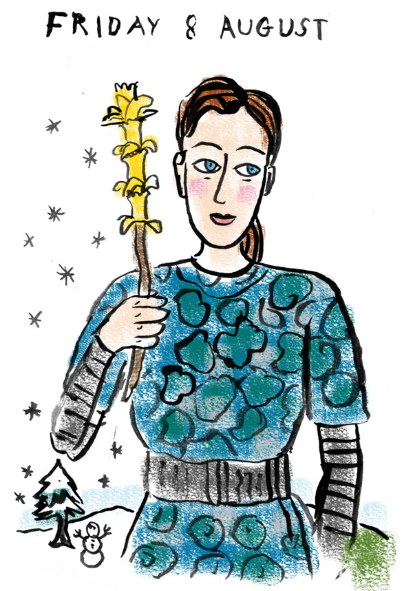 Violet made me this Katy Perry Roar staff by picking the remainder of the daffodils and threading them on a stick. I’m sad for my daffodils, but I’m impressed by their sculptural qualities. I’m wearing a favourite op shop dress that my friend Helen sent me a few years back (you can see it for real here) and I added snow because my friend Drew sent me a picture of himself in the Dunedin blizzard. Snow! I haven’t seen you for so long.
