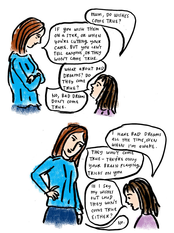 Hello! It is school holidays and I am sneaking some quick comics in while my children have their designated screen time. I’m quite fascinated by how Violet has invented her own superstition, or perhaps ritual around managing her fears.I too was paranoid about random dreadful things happening to me when I was a child – that my eyes might explode, that my legs would snap off, that the monsters would rise up and eat me. These days my fears are too terrifying to articulate – I did consider drawing some of my own, but I was too superstitious to do so. I’ve heard it said that you should write what you most fear and that’s where your most powerful writing will come from. But I’m too scared to do that too.